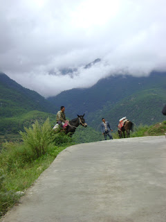 in and out of view. The side of the gorge we were on was the shorter side with green hills leading up to rocky terrain. We still made it to a height of 2670 meters (8760 feet) with mountain still left above us. The ecosystem was a strange range of pine trees, palm trees, ferns and lots of flowers that seemed to have impossibly vibrant colors. The first day of the hike was hard even for those of us in tip top shape. We made a couple hours of medium difficulty terrain and stopped for lunch at one of the hostels along the way.This was by far the best meal we had all week in my opinion. It was all Chinese food but had Naxi and Tibetan traits mixed in. By this time both Greg and I had been suffering on the trip with our heavy backpacks and lack of physical ability. The entire town of Qiaotou thrives off of the tourists that stumble through on the way to the gorge. One portion of this is the donkey men. Each group of travelers gets paired with a man and his donkey. They follow you through the trail waiting for the moment when you break and decide you have had enough of either walking or of carrying your pack. Well we cracked. So we hired our guy to carry Greg and I’s packs for 200 kuai. It was probably the best spent money of our trip. As the hike progr